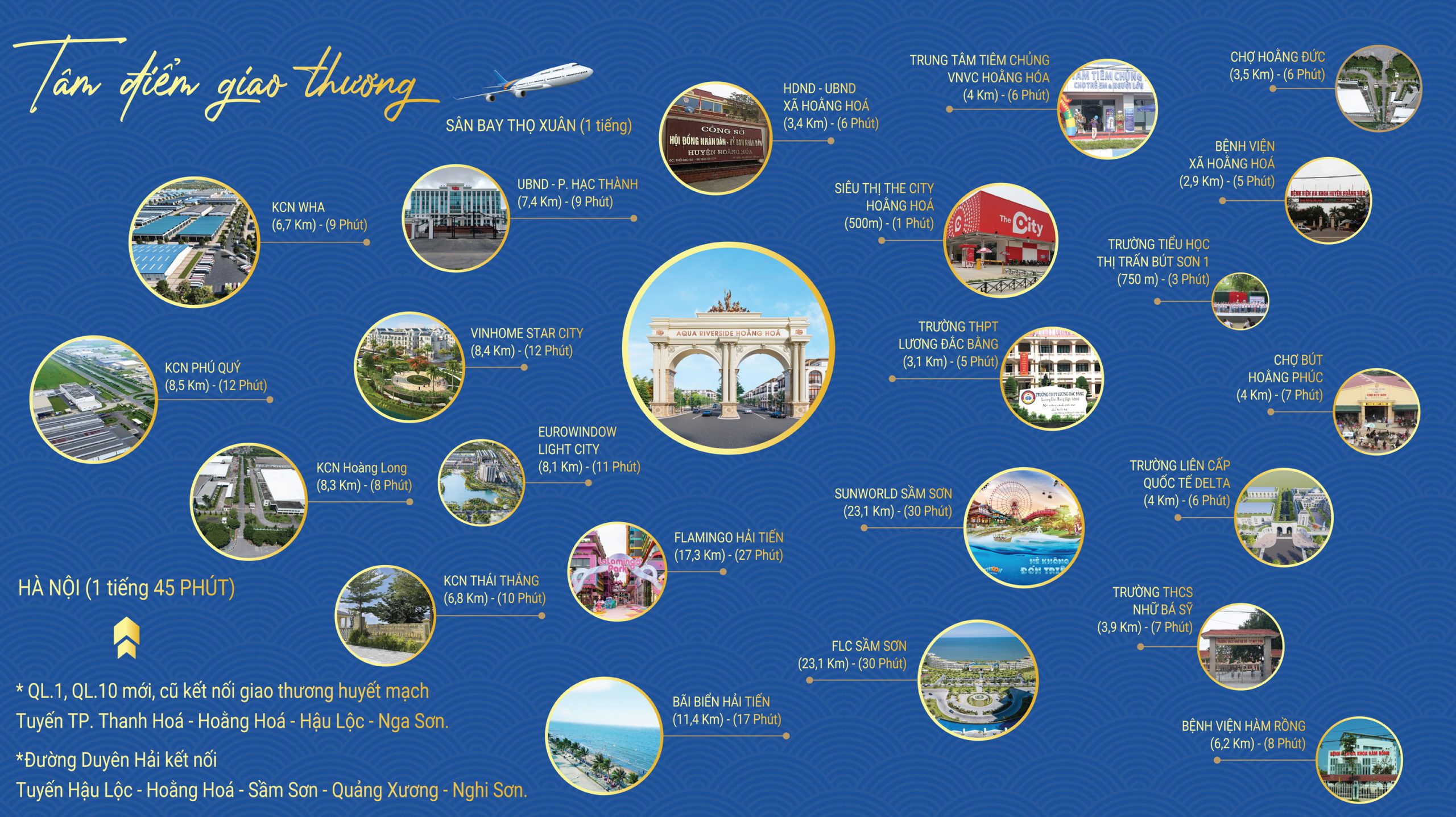 - Tam Cận Lộ: Với mặt tiền trải dài trên Quốc lộ 10 và chỉ cách nút giao Quốc lộ 1A 1km, Aqua Riverside là cửa ngõ giao thương kết nối trực tiếp đến TP. Thanh Hóa, các khu công nghiệp và thiên đường du lịch biển Hải Tiến.