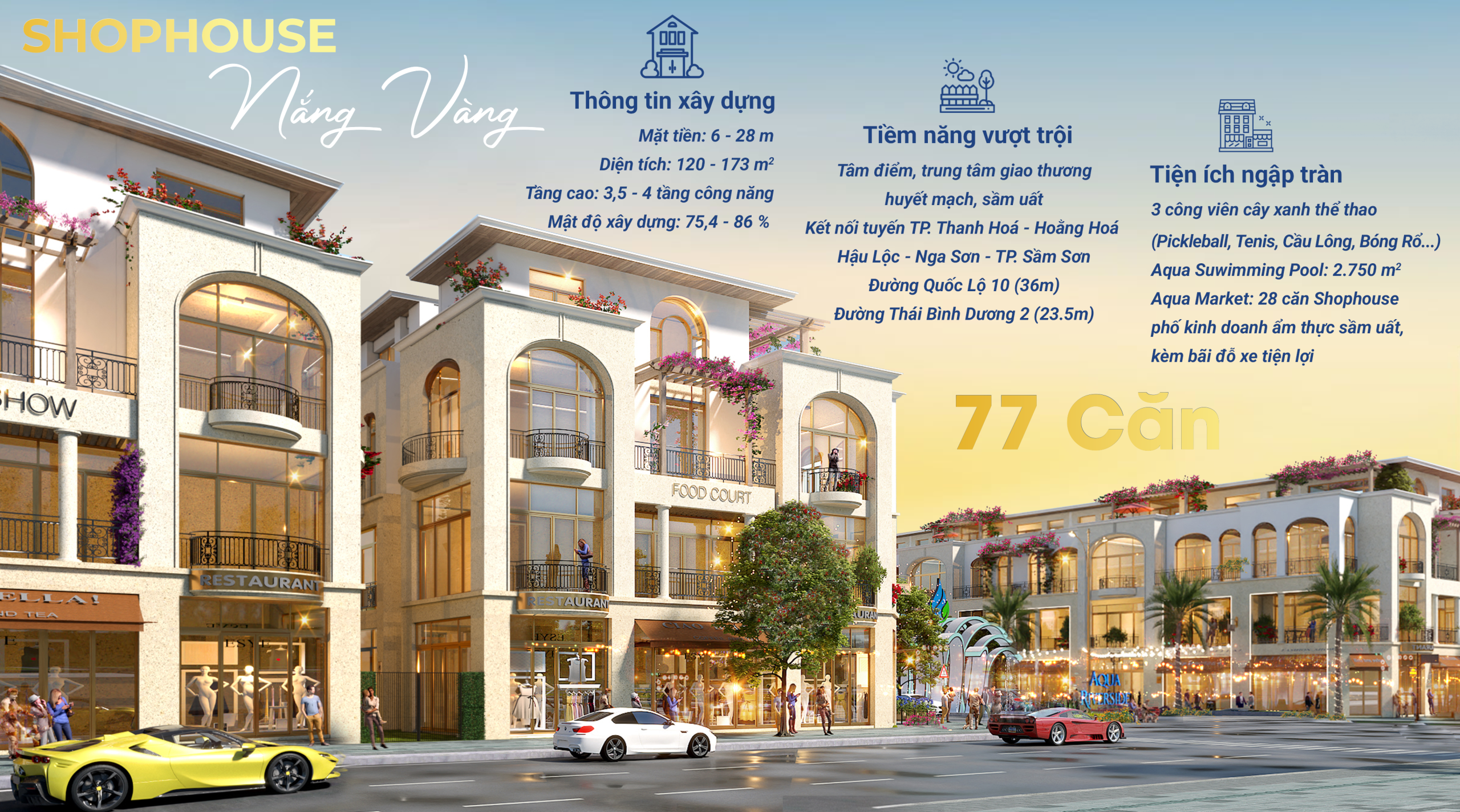Phân khu Nắng Vàng không chỉ là một phần của dự án Aqua Riverside Hoằng Hóa, nó là chương mở đầu rực rỡ, là tâm điểm của sự phát triển và là nơi hội tụ của dòng chảy thương mại. Với vị trí độc tôn ngay cửa ngõ, quy hoạch sản phẩm thông minh hướng đến tối đa hóa lợi nhuận và hệ sinh thái tiện ích “all-in-one” đẳng cấp, Phân khu Nắng Vàng mang đến một cơ hội không thể bỏ lỡ.