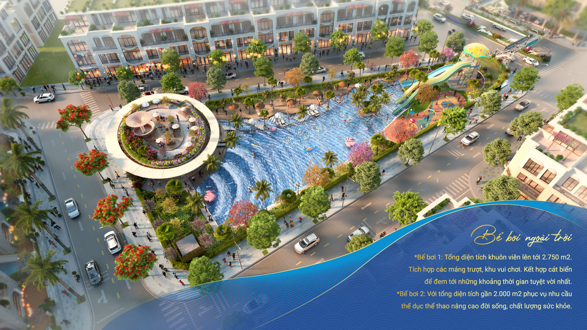 - Bể bơi ngoài trời Aqua Swimming Pool 1: Với tổng diện tích lên tới 2750m², đây là bể bơi gia đình lý tưởng với khu vui chơi trượt nước và sân chơi cát an toàn cho trẻ em, kết hợp dịch vụ ăn uống tiện lợi.